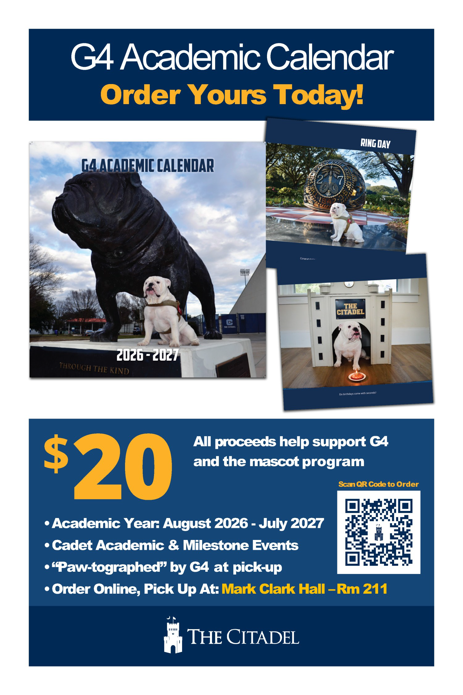 The Citadel’s new 2026–27 G4 Academic Calendar drops on March 20, featuring fresh photos of everyone’s favorite Bulldog, G4. All proceeds support the Citadel Live Mascot Program.